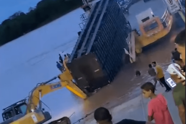 Parte de carreta carregada com gado cai de balsa após cabo de aço se romper durante travessia no Rio São Francisco, em Manga