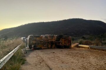 Carreta carregada com areia tomba na BR-242 e deixa duas pessoas feridas