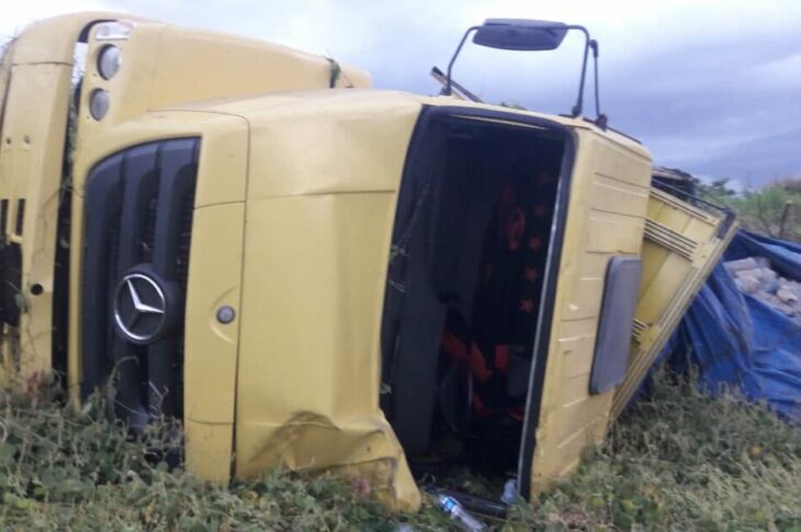 Ex-vereador Jadinha tomba caminhão carregado com cimento na BR-30 em Palmas de Monte Alto