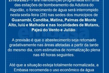 Embasa anuncia interrupção de água em Guanambi e mais 5 cidades da região