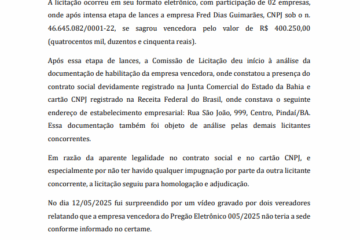 Vereadores acionam MP após empresa sem endereço vencer licitação de mais de R$ 400 mil em Pindaí