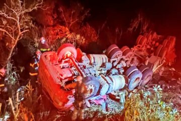 Carreta tomba e motorista fica preso às ferragens em São Desidério