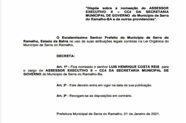 Filho do vice-prefeito de Serra do Ramalho é nomeado Assessor Executivo