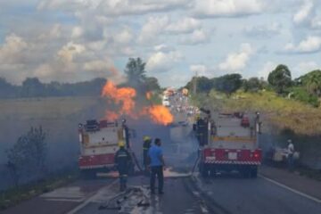 BR 365 em Patrocínio:três caminhões, um ônibus e caminhonete incendiados