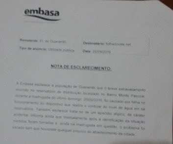 A EMBASA- Empresa Baiana de Água e Saneamento (EMBASA) encaminhou uma nota ao portal Folha do Vale na última terça-feira, 27 de setembro. Na nota, a embasa esclarece à população de Guanambi, que o breve extravasamento ocorrido no reservatório de distribuição localizado no bairro Monte Pascoal, durante a madrugada do ultimo domingo (25), foi causado por uma falha no funcionamento do dispositivo que realiza o controle do nível de água em tal reservatório.