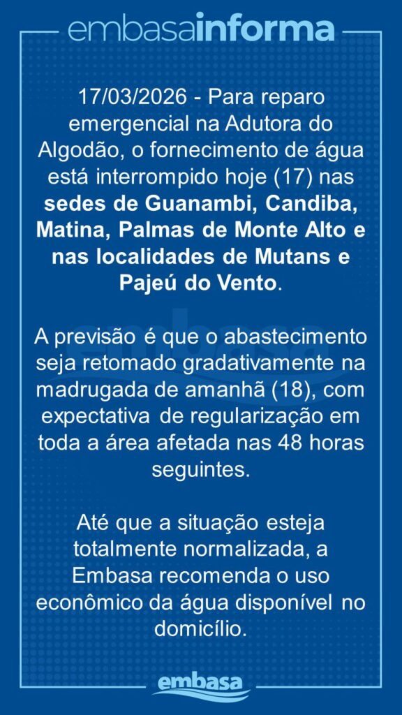 Em nota enviada à Folha do Vale, a Empresa Baiana de Águas e Saneamento (Embasa) informou que o serviço foi suspenso nas cidades de Guanambi, Candiba, Palmas de Monte Alto e Matina, além dos distritos de Mutãs e Pajeú dos Ventos, no município de Caetité.