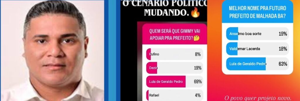 MALHADA — Uma enquete para as eleições municipais de 2028, divulgada no domingo (7) em Malhada, na região sudoeste da Bahia, mostra o presidente da Câmara de Vereadores, Lula de Geraldo Pedro (Avante), à frente, com 63% dos votos válidos, seguido do ex-prefeito Anselmo Alves Boa Sorte (PL), com 19%.
