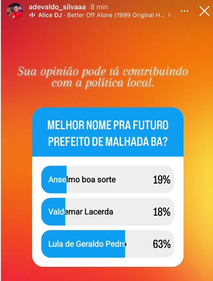 O terceiro é Valdemar Lacerda Silva Filho, Dezin (MDB), com 18%. Em outro cenário, a enquete realizada no Instagram de Adevaldo Silva, cita nomes com possível apoio do prefeito Gimmy Ramos (PT). Nesse cenário, Lula lidera com 69%, Dezin aparece com 19%, o vice-prefeito Manoel Rufino (PT), com 8%, o vereador Rafa Enfermeiro (PT), com 4%.