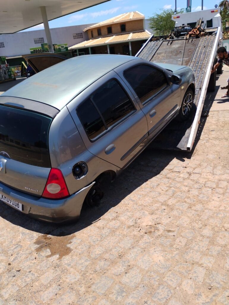 Após denúncia, a equipe se deslocou por volta das 11h40 até a Avenida Prefeito José Neves Teixeira, onde encontrou o carro estacionado na entrada de um posto de combustível, faltando uma das rodas traseiras e apresentando CLRV vencido.