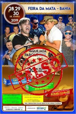 Um banner similar ao cartaz oficial em que a Prefeitura de Feira da Mata divulga à realização da 7ª edição da Vaquejada do município nos dias 28, 29 e 30 de junho do ano em curso, vem circulando no aplicativo Whatsapp desde o último domingo(31). A falsa publicidade anuncia a apresentação do cantor Tayrone no primeiro dia de festa e trás a foto do cantor em destaque.