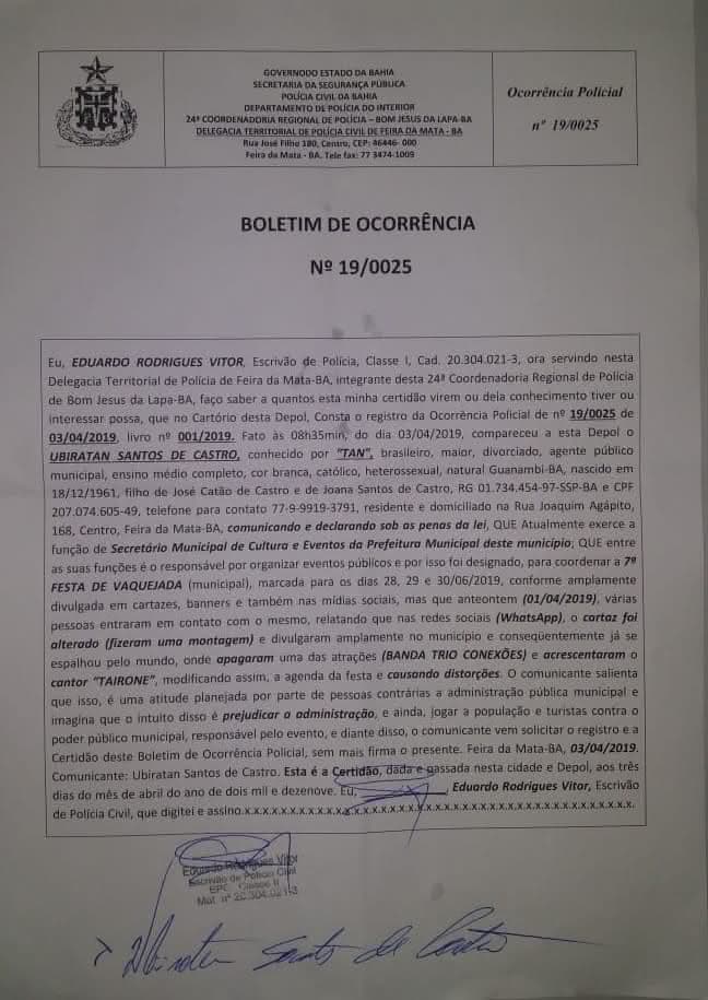 Esclarece ainda que um banner que circula nas redes sociais levando a marca da Prefeitura de Feira da Mata anunciando o artista Tayrone como atração da 7ª Vaquejada, trata-se de uma fraude maldosa que tem a pretensão de colocar a população do município e turistas contra a administração pública e criar um pretencioso factoide político. Esclarece que o município não formalizou contrato com o artista Tayrone ou anunciou este artista na grade de atrações para a 7ª. Vaquejada a ser realizada em junho de 2019.