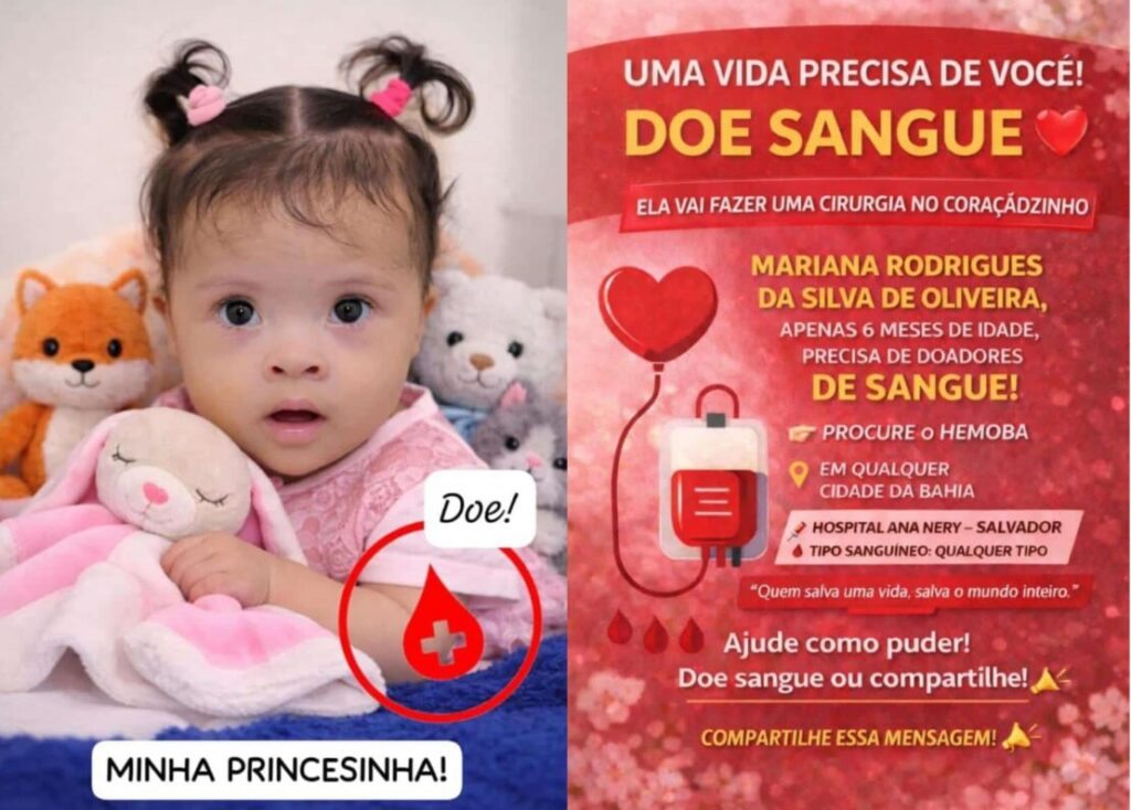 SALVADOR — A família da pequena Mariana Rodrigues da Silva Oliveira, de 6 meses, está mobilizando uma campanha de doação de sangue de qualquer tipo sanguíneo. Ela nasceu com cardiopatia e passará por uma cirurgia cardíaca no próximo dia 17 de fevereiro, no Hospital Ana Nery, na capital baiana.