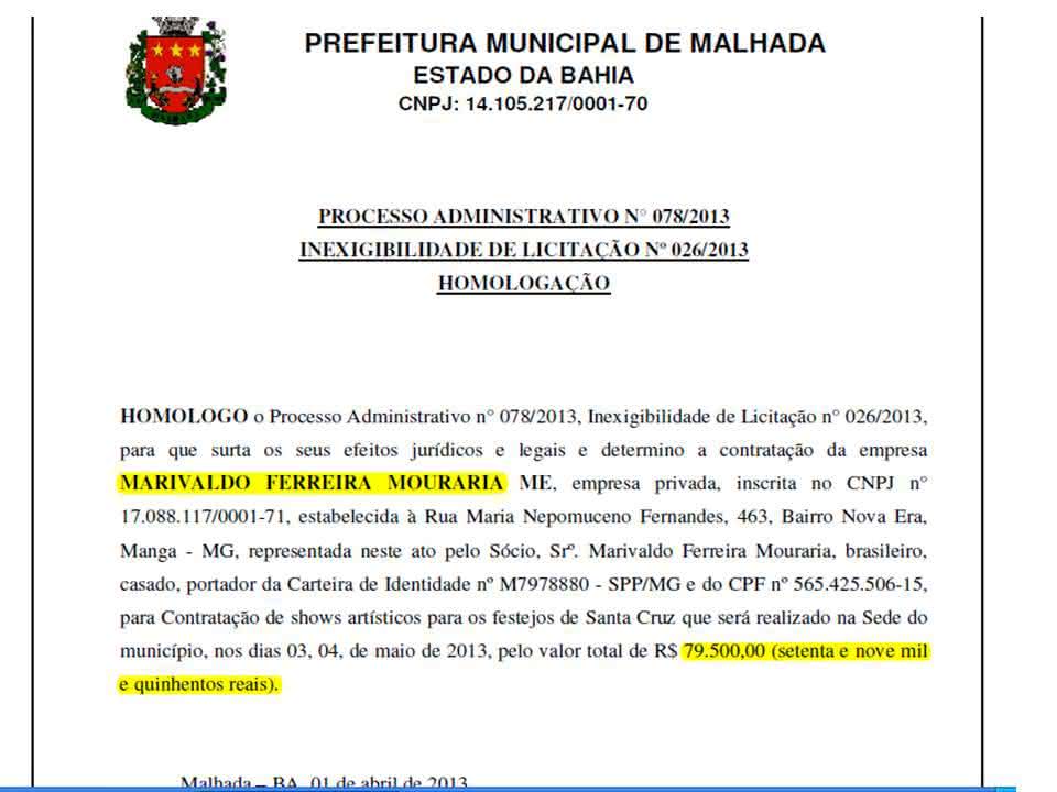 A empresa ME representada por Marivaldo Pereira Mouraria, foi responsável por contratar as atrações dos festejos de São Pedro em Canabrava, em 2011.