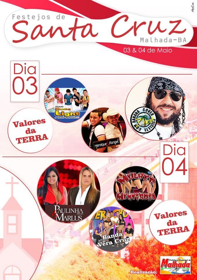 A empresa ME é quem irá realizar os festejos de Santa Cruz, nos dias 3 e 4 de maio, na cidade de Malhada, no sudoeste da Bahia. De acordo com o processo que foi homologado e dispensou licitação serão gastos R$ 79.500,00(setenta e nove mil e quinhentos reais).