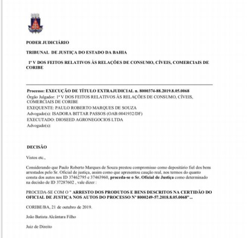 O grupo afirma que diferente do que foi dito pela empresa Diossed, foi retirado da fazenda 140 toneladas da semente e levada para ser armazenada em outra fazenda. “Informo que as sementes encontram-se estocadas na fazenda Santa Paula, uma vez que eu tenho a guarda e a posse desses bens, isentado assim a empresa SafraSul, pois essa não possui nenhum vínculo e foi citada para desestabilizar o mercado de sementes”,encerra.