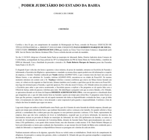 “Há duas semanas houve uma decisão judicial que determinou que diante da falta de pagamento fosse feita a reintegração de posse, mas isso não ocorreu. Na mesma decisão foi determinado que alguns bens ficassem na fazenda para garantir o pagamento dos 12 milhões”, disse o proprietário.