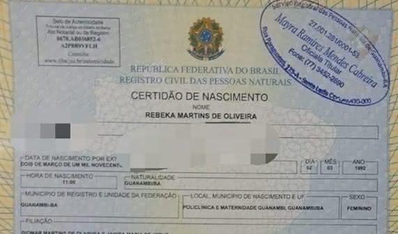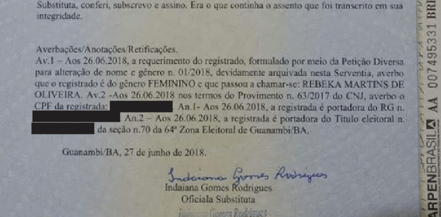 Nesta quarta-feira (27) ficou pronta a nova certidão de Rebeka Martins de Oliveira, antes Rodrigo Martins de Oliveira. Aos 27 anos, a transexual poderá agora alterar todos os seus documentos com seu nome feminino. Além da nova certidão de nascimento, foi emitida uma certidão de inteiro teor descrevendo a alteração.