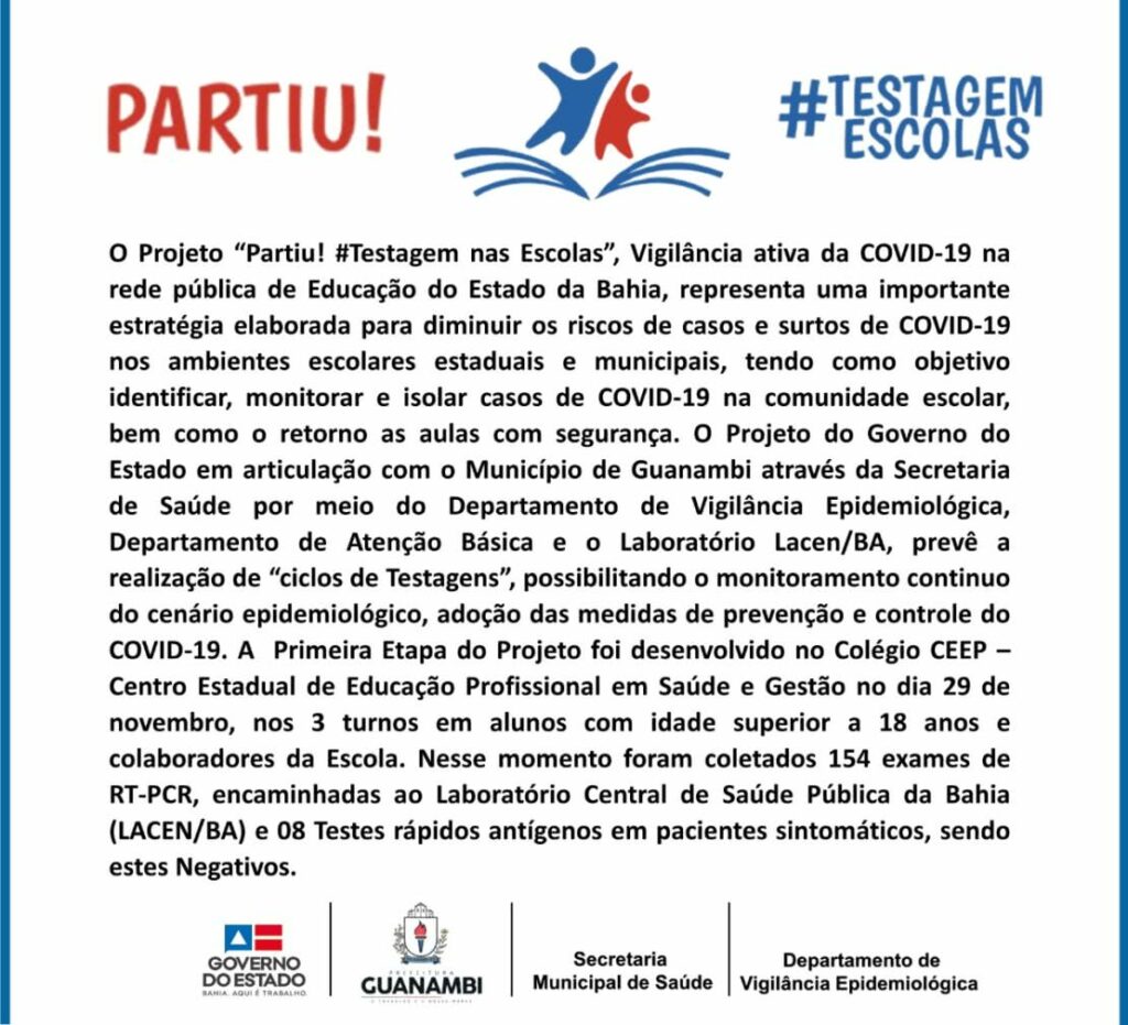Além desse número de pessoas aguardando resposta do exame, a Prefeitura de Guanambi informa que 154 alunos da rede pública municipal e estadual esperam pelos resultados do teste para Covid-19. Recentemente, o Governo do Estado iniciou testagens em massa para identificar o cenário pandêmico, e avaliar o retorno às aulas presenciais.