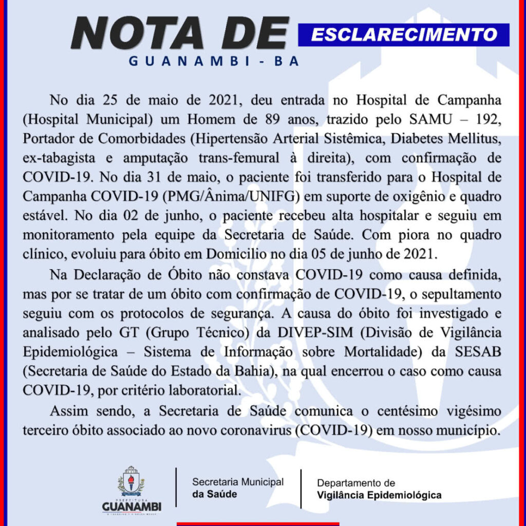 Na Declaração de Óbito não constava Covid-19 como causa definida. A causa do óbito foi investigado e analisado pelo Grupo Técnico da DIVEP-SIM (Divisão de Vigilância Epidemiológica Sistema de Informação sobre Mortalidade) da Sesab. Por critétios laboratoriais, os investigadores concluiu que óbito teve relação com a Covid-19.
