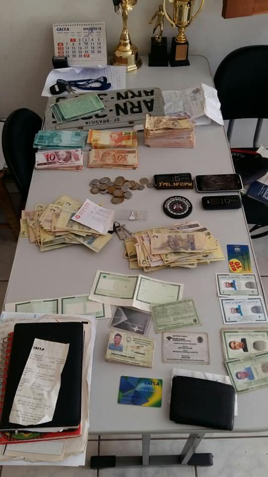 Os policiais aprenderam com Benedito, um veículo Fiat Uno Mile Fire,licença de Brasilia-DF,placa, JGA 9992,cor branco, duas células de identidade em branco, três CRLV’s, sendo dois falsificados, vários comprovantes de deposito feitos no dia anterior e mais vários tipos de mercadorias que haviam sido compradas no comércio local utilizando notas falsas.