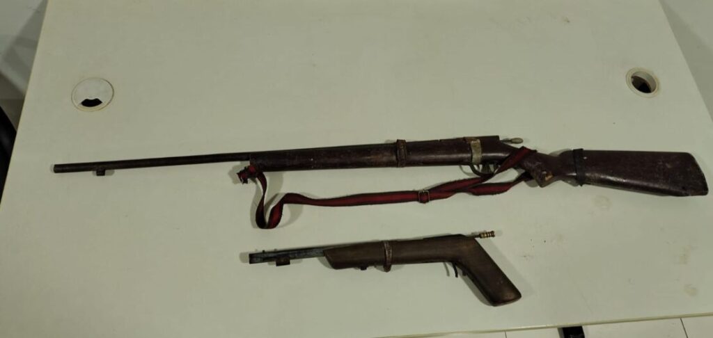 O segundo suspeito jogou a arma na parte interna da residência, na qual permaneceu no local. Foi realizada a abordagem e busca no perímetro, em que foram encontradas 02 armas de fogo, sendo uma do tipo espingarda e outra do tipo garrucha, ambas de fabricação artesanal.