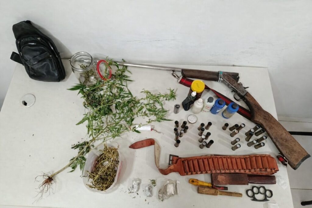 No local, embora a pessoa alvo do mandado não tenha sido encontrada, os militares localizaram material ilícito em posse de um homem residente no imóvel. Durante a abordagem e busca, foi apreendida uma espingarda calibre 20 com numeração suprimida, além de cartuchos, insumos para recarga de munição e substância análoga à maconha.