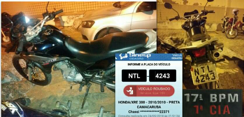 Policiais do Pelotão de Motociclistas da 1ª CIA do 17º Batalhão da Polícia Militar de Guanambi,prenderam na noite da última quinta-feira, 24 de maio, no bairro Beija-Flor, dois homens a bordo uma moto Honda/XRE 300, cor preta, de placa policial NTL-4243, com licença Espinosa.