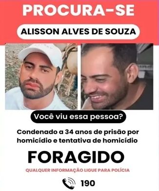 IUIU — Alisson Alves de Souza, condenado a 34 anos e 6 meses de reclusão, em regime fechado, pelo Tribunal do Júri, no dia 23 de outubro, na cidade de Carinhanha, na região sudoeste da Bahia, pelos crimes de homicídio qualificado, porte ilegal de arma de fogo e tentativa de homicídio, encontra-se foragido.