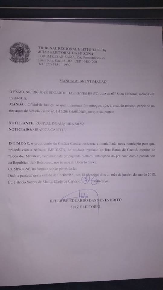 O Juiz Eleitoral da 63ª Zona Eleitoral de Caetité, no Sudoeste da Bahia, José Eduardo das Neves de Brito, ordenou nesta quinta-feira (18), que o proprietário da Gráfica Caetité, retire imediatamente o outdoor com a imagem do presidenciável e deputado federal Jair Bolsonaro (PSL-RJ), instalado na Rua Barão de Caetité, esquina do Beco dos Milhões, na última quarta-feira, 17 de janeiro.