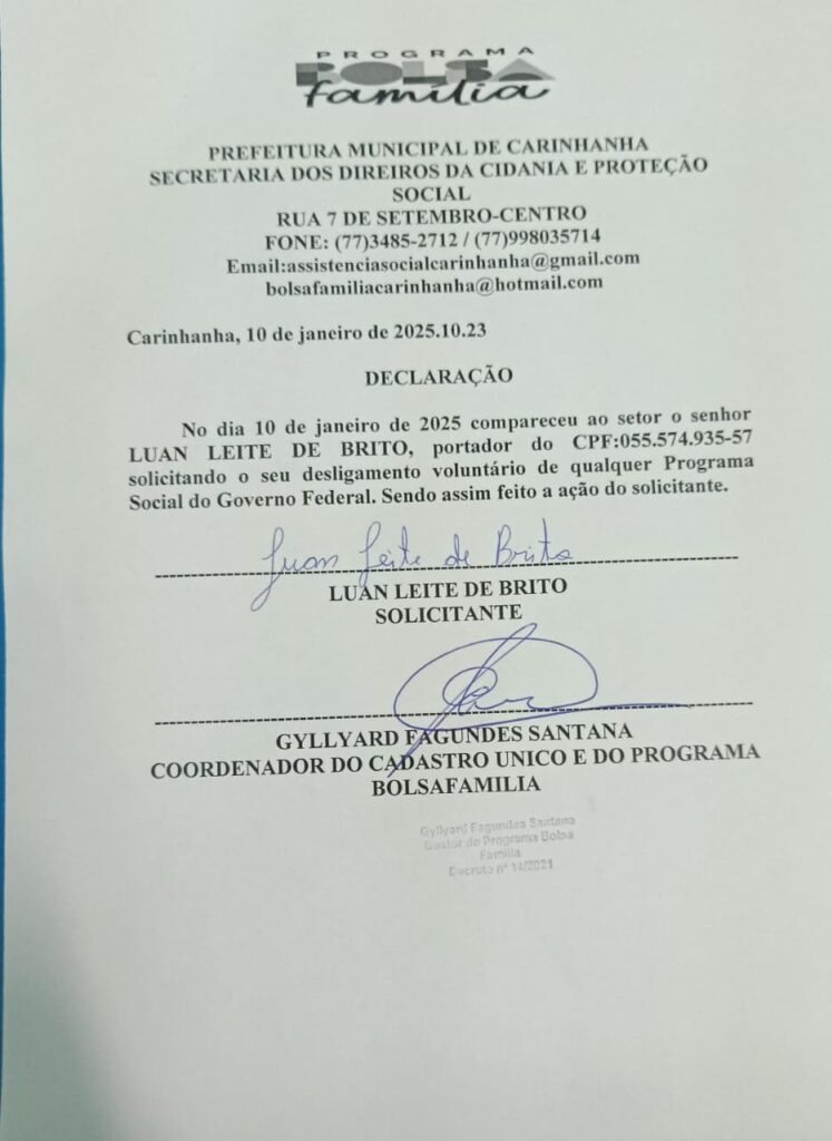Venho esclarecer que essa declaração comprova minha ida ao setor do Bolsa Família no dia 10 de janeiro de 2025, quando solicitei o desligamento de todos os programas sociais que, porventura, estivessem vinculados ao meu nome.