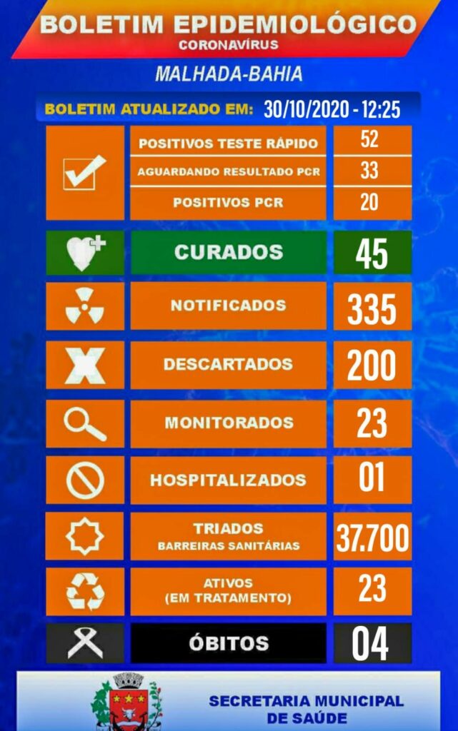 Ao todo, Malhada registra 72 casos, com 45 curados, 23 ATIVOS, 4 óbitos e 33 pacientes aguardam resultados de PCR.