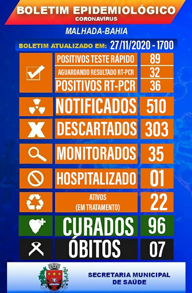 Ao todo, Malhada registra 125 casos de covid-19, sendo 96 curados, 22 ativos, 7 mortos e um paciente hospitalizado.