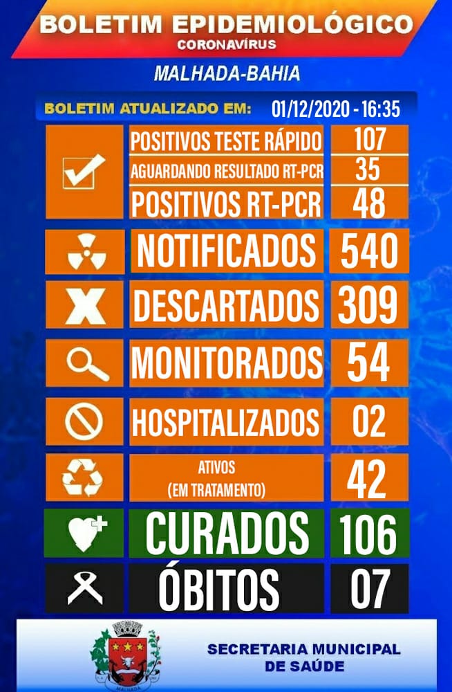 Ao todo, Malhada registra 155 casos de covid-19, sendo 106 curados, 42 ATIVOS e 7 óbitos. Dois pacientes continuam hospitalizados.