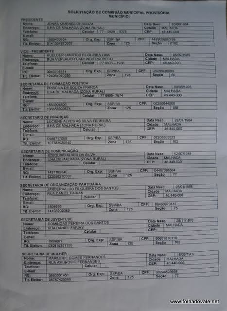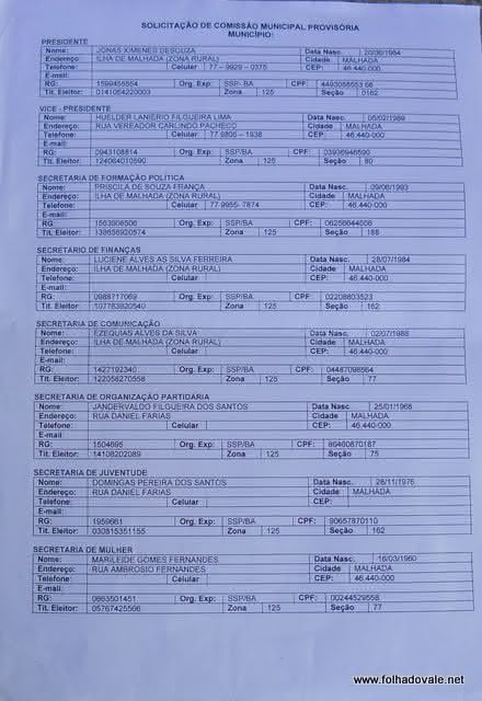 A Comissão Provisória ficou assim constituída: presidente, Jonas Ximenes de Souza; vice-presidente, Huelder Lanierio Figueira Lima ; Secretaria de Formação Politica, Priscila de Souza Santos; Secretário de Finanças, Luciene Alves Silva Ferreira.