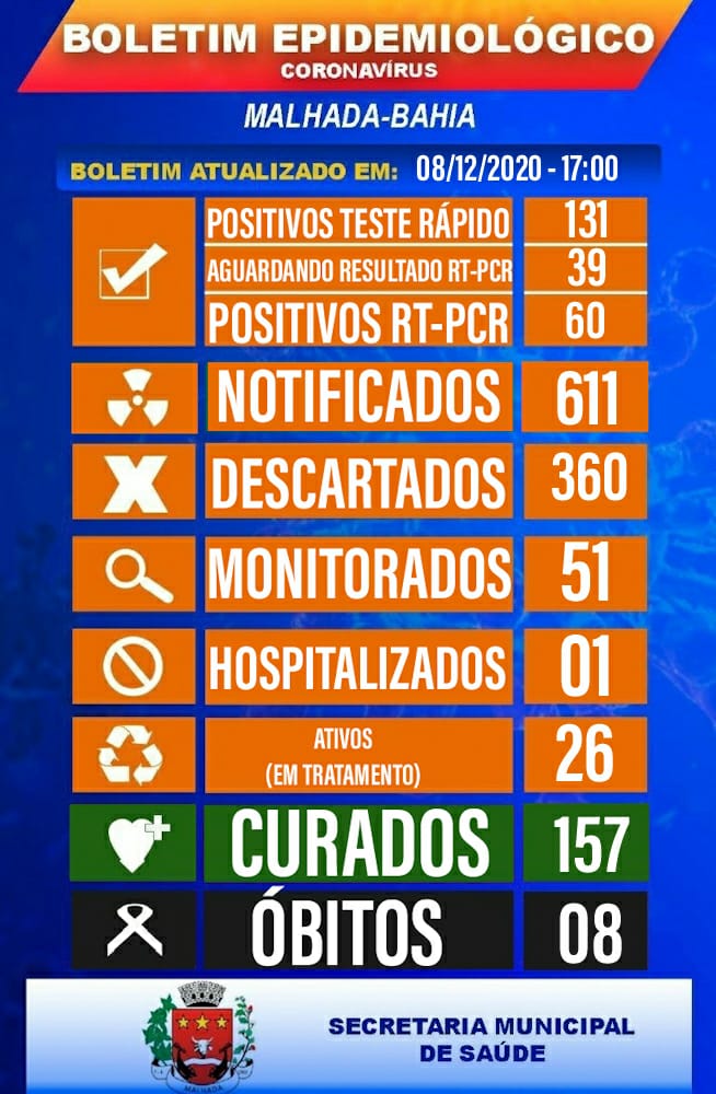 Ao todo, Malhada registra 191 casos de covid-19, sendo 157 curados, 26 ATIVOS e 8 óbitos. Outros 39 aguardam resultado laboratorial.