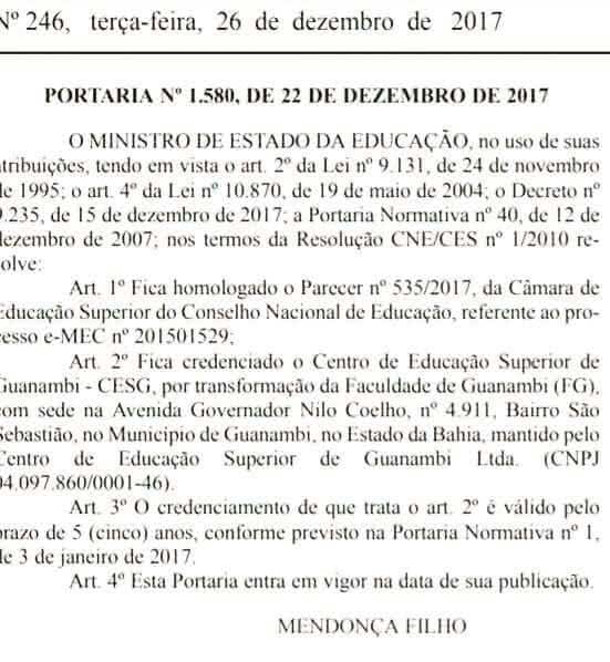 O Ministro da Educação, Mendonça Filho, transformou a Faculdade Guanambi (FG), em Centro Universitário Guanambi-CESG, conforme a publicação do MEC- Ministério da Educação nesta terça-feira (26). A portaria Nº 1.580, foi publicada pelo órgão no dia 22 de dezembro.O credenciamento tem validade de 5 (cinco anos),conforme uma portaria do MEC deste ano.