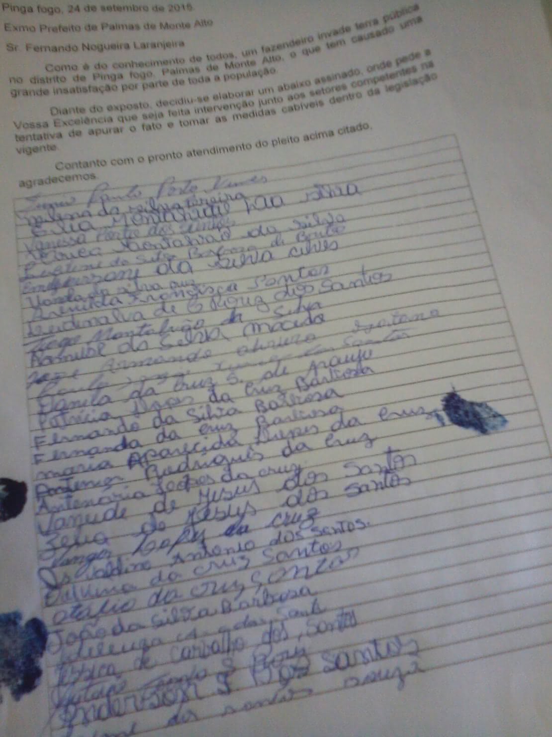Moradores conseguem mais de 100 assinaturas para impedir invasão de fazendeiro em terras públicas em Palmas de Monte Alto