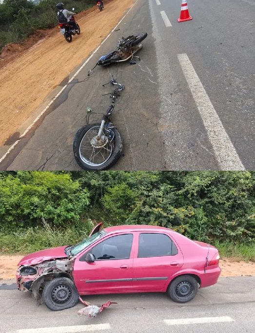A colisão envolveu uma motocicleta CG 125 Titan, de cor azul, e um automóvel Prisma Maxx, de cor vermelha. Com a força do impacto, a motocicleta chegou a se partir ao meio.