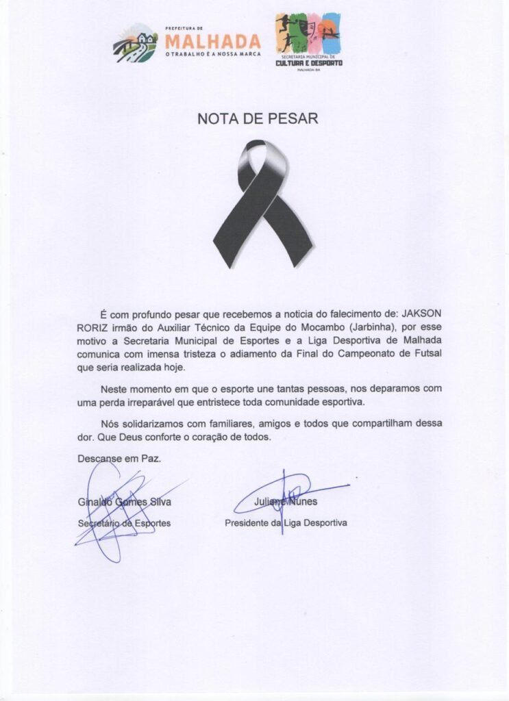 Diante da tragédia, a Secretaria Municipal de Esportes adiou os jogos da final do campeonato que acontecia na noite deste sábado. Neguim é irmão do auxiliar técnico da equipe do Mocambo. A secretaria lamentou o ocorrido e se colocou à disposição da família.