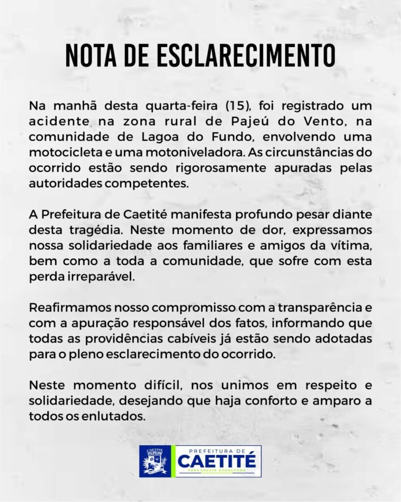 Em nota, a Prefeitura de Caetité manifestou pesar pela morte e se solidarizou com os familiares da vítima. O município informou ainda que o caso está sendo apurado e será conduzido com transparência.