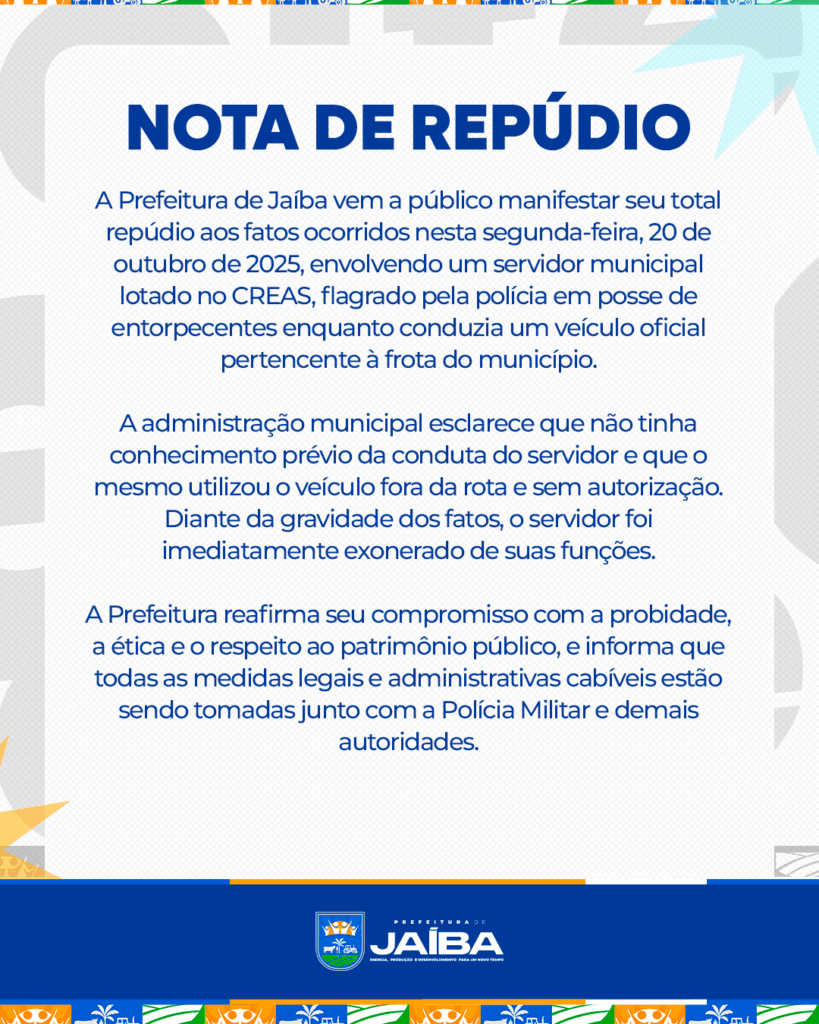 Em nota, o prefeito Jimmy Murça, repudiou a situação envolvendo um funcionário do Centro de Referência Especializado de Assistência Social (CREAS). O chefe do Executivo afirma na nota que o servidor foi exonerado do cargo, não fazendo mais parte do quadro de servidor.