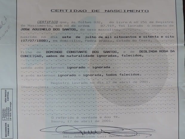 A idade de Zé Aguinelo foi estabelecida por um juiz da Comarca de Bauru após uma entrevista detalhada. A cidade natal do idoso na certidão é Pedra Branca, no Ceará. O idoso contou que procurou o interior de São Paulo para trabalhar e depois de algumas cidades conseguiu empresa em uma fazenda de café da região de Iacanga (47 quilômetros de Bauru).