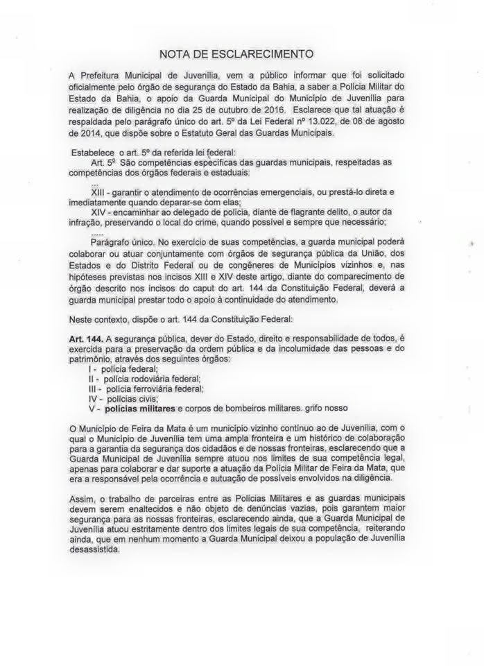 Nota de Esclarecimento da prefeitura de Juvenília sobre a atuação da guarda na Bahia