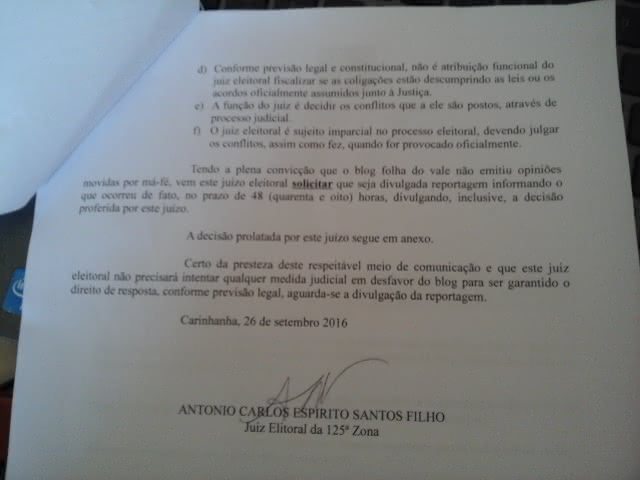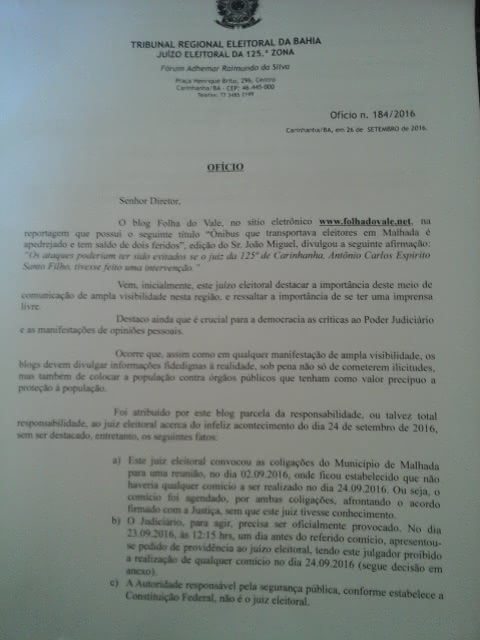 Diante da repercussão da matéria, o juiz eleitoral da 125ª de Carinhanha, Antônio Carlos Espirito Santo Filho, notificou portal para fazer alguns esclarecimentos. O portal Folha do Vale, que em momento algum atribuiu a responsabilidade dos fatos ao magistrado. Quando citamos na reportagem a palavra intervenção, foi é no sentido de pedir um efetivo maior a Polícia Militar, não de jogar a responsabilidade ao juiz, já que o portal Folha do Vale é um parceiro da justiça.
