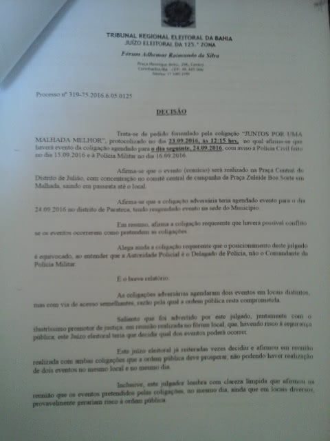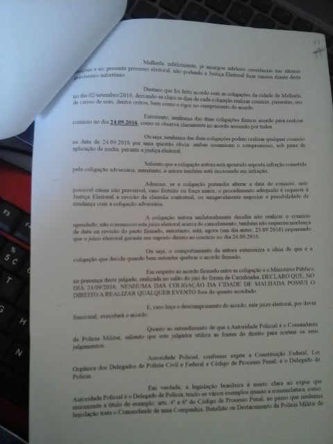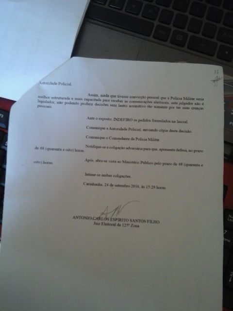 O magistrado afirma ainda que para o Judiciário agir precisa ser oficialmente provocado, tanto que no dia 23 de setembro, às 12h15min, um dia antes do ocorrido foi apresentado um pedido de providencia ao juízo eleitoral, tendo este julgado e proibido à realização de qualquer com comício dia 24 de setembro.