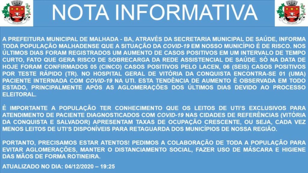 Com o aumento expressivo de casos da covid-19, a secretaria de Saúde emitiu um alerta informado que os casos aumentaram não só em Malhada, mas em todo Estado.