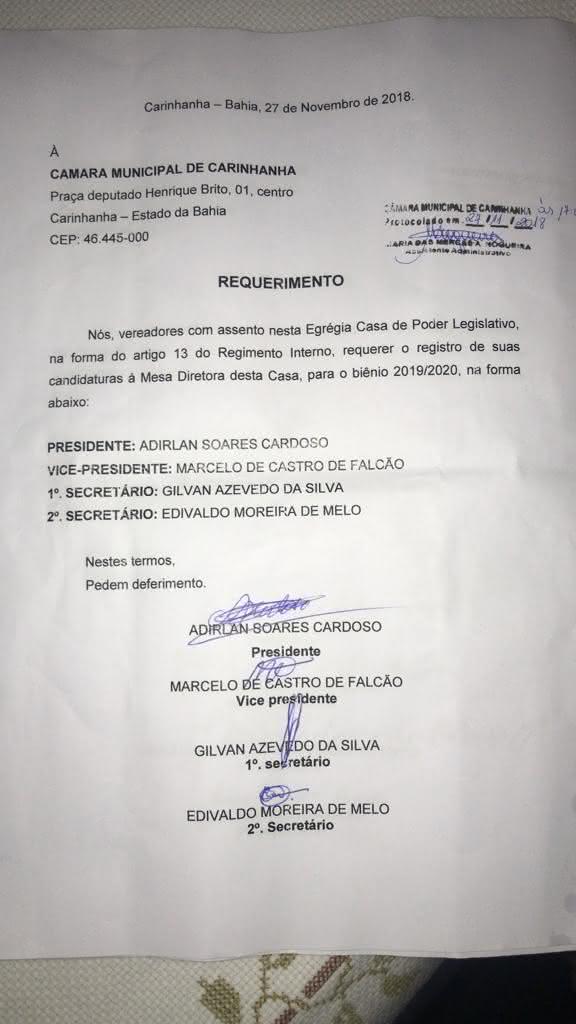 Oposição e situação registraram as chapas para concorrer à presidência da Câmara de Carinhanha, no oeste da Bahia, para o biênio 2019/2020. Conforme o artigo 13 do Regimento Interno, o prazo final para protocolo ficou estipulado para terça- feira, 27 de novembro, 15 dias antes da eleição que deve ocorrer na ultima sessão antes do recesso parlamentar de final de ano, ou seja, 18 de dezembro.