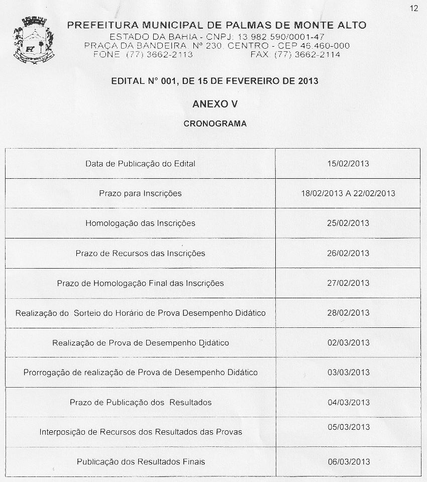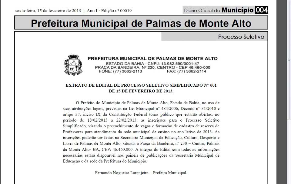 A Prefeitura de Palmas de Monte Alto, na Bahia, por meio da Secretaria Municipal de Educação, torna pública, a abertura do edital de inscrição para o Processo Seletivo Simplificado, visando o preenchimento de vagas e formação de cadastro de reserva de Professores para atendimento da rede municipal de ensino no ano letivo de 2013.