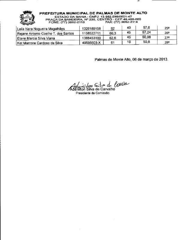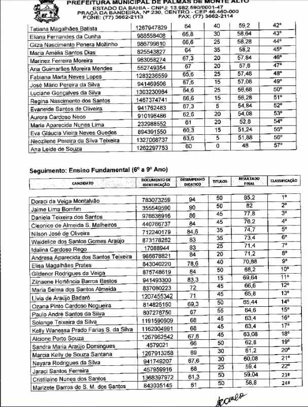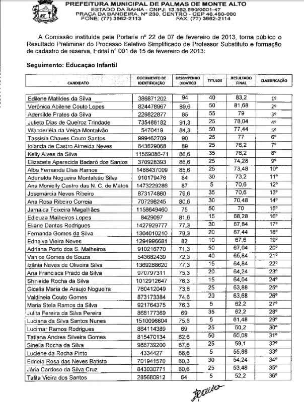 A Comissão Organizadora divulgou na tarde desta quarta-feira (6), o resultado preliminar do Processo Seletivo Simplificado de Professor Substituto e Formação de cadastro de reserva, para o exercício no ano letivo de 2013 na Rede Municipal de Ensino de Palmas de Monte Alto (BA), em regime de designação temporária.