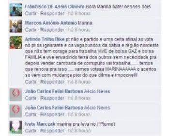 “O PT não é partido, é uma seita. Afinal, só vota no PT os ignorantes e vagabundos da Bahia e a região Nordeste, que não tem coragem para trabalhar. Vivem de Bolsa Gás, Bolsa Família e vivem invadindo terra dos outros sem necessidade para depois vender. Cambada de corruptos. Vão trabalhar... Temos que renovar para isso. Vamos votar em MARINAAAAAA. Os acertos só vêm com mudança. Pior do que Dilma é impossível”, escreveu Arlindo.